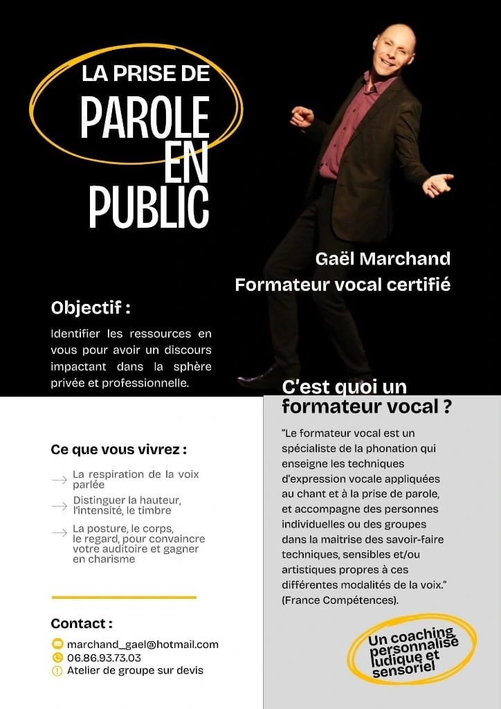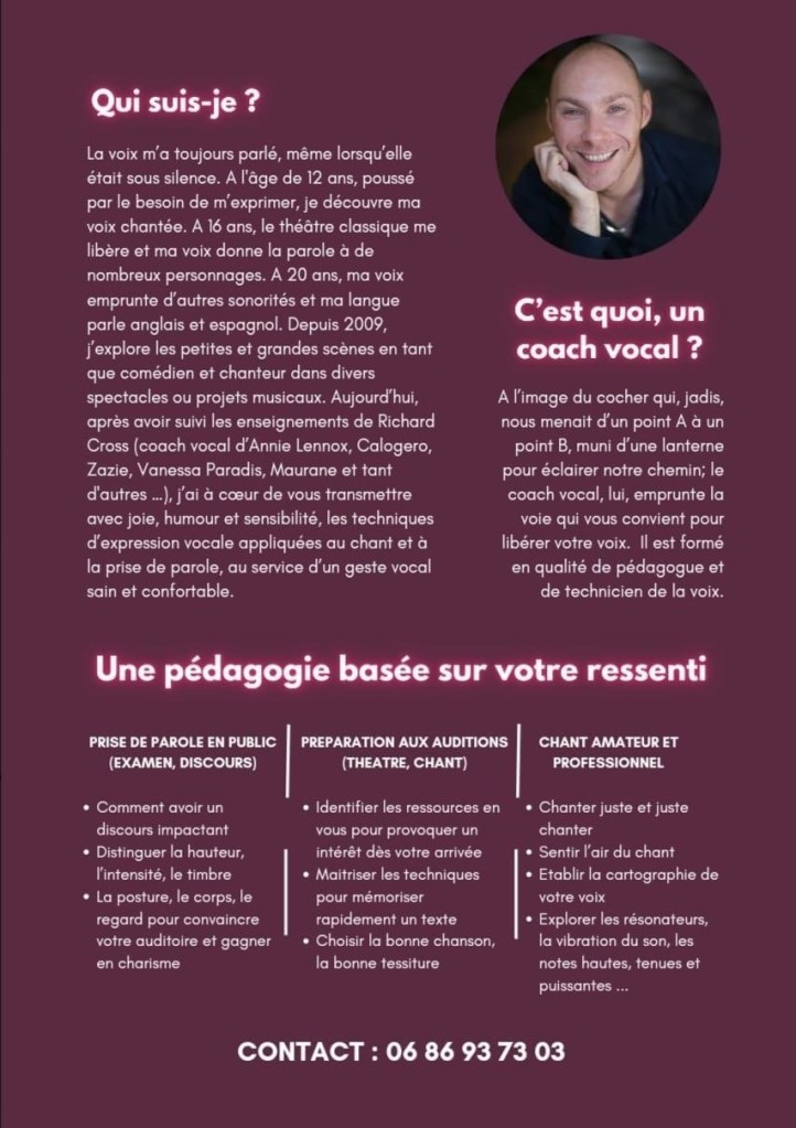 Depuis Janvier 2023, et comme une évidence, j’ai à cœur de vous transmettre avec joie, humour et sensibilité, les techniques d’expression vocale appliquées au chant et à la prise de parole, au service d’un geste vocal sain et confortable.